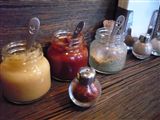 卓上の調味料です。左から、ニンニク、一味唐辛子、豆板醤、カレー粉、山椒、胡椒です。