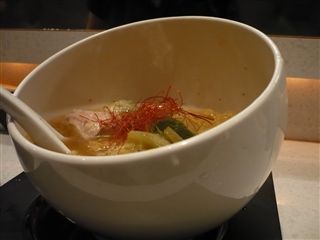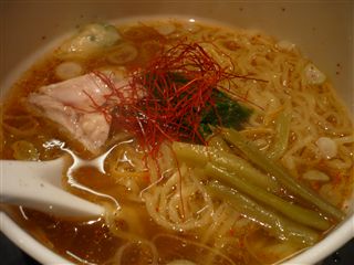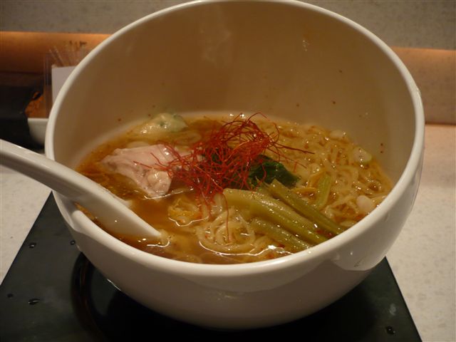 まず、スープ。海老油の風味とコクが堪能できます。また、ピリッと辛く味覚が目覚めさせられます。決して糸唐辛子を食べたわけではないのですが、辛味が程よく振りかけられています。