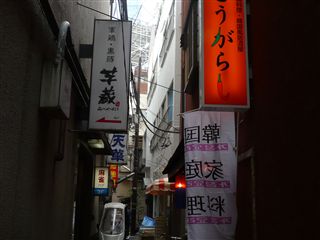 高層ビルが立ち並ぶ品川港南口ですが、この近辺は再開発から取り残されたようなレトロな路地が残っています。狭く怪しい雰囲気の路地を入っていくと、昭和チックなお店が見えてきます。