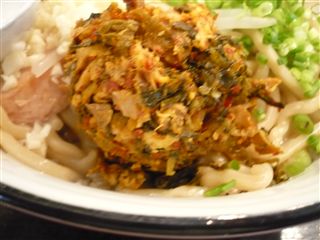 丸い団子のようなものは、辛子高菜と鶏肉が和えて団子状になっているものです。激辛なので、少しづつ崩して食べていきます。
