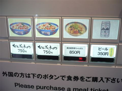 何を頼もうかとワクワクして見ると、左から3つ目は売り切れです。ちゃんぽんラーメン750円しかありませんでした。選択の余地は無いです!