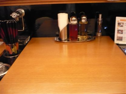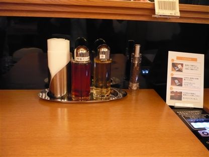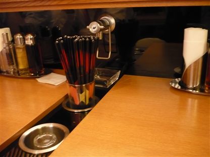 カウンター毎の区切り地帯には、コップと再利用箸、お冷の蛇口です。