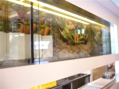 入り口左の大きなガラス窓に向けて、店内厨房コンロが設置されています。店外から、中華なべをあおって具材を炒めるパフォーマンスを、見ることができます。