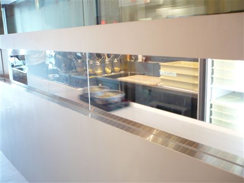 街路に面した厨房から通路を隔てて奥の店内までは、ちゃんぽんを運ぶベルトコンベアーが敷設されています。
