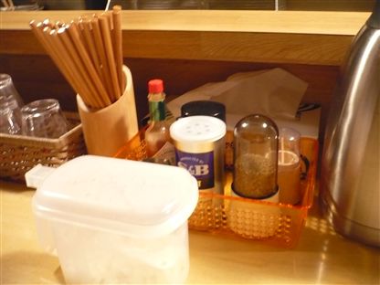 お箸は洗い箸です。白いタッパーには刻み玉ねぎが入っています。さらにタバスコが常備されています。