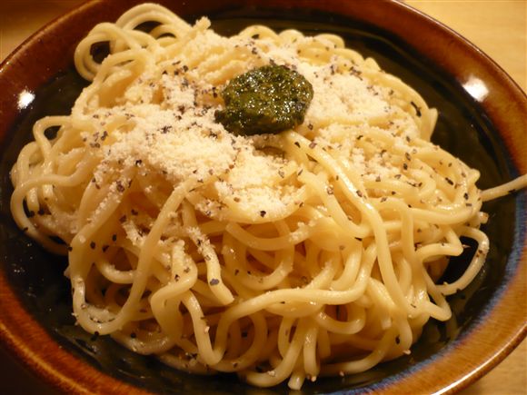 中太ストレートの麺の上には、パルミジャーノとパセリが振りかけられ、中央にはバジルペーストがトッピングされています。