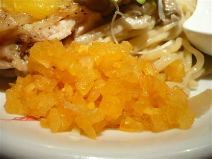 それでは、順に具のご紹介。お皿のやや右手に盛り付けられたオレンジのオブジェ、なんと細かく切られた柿でした。