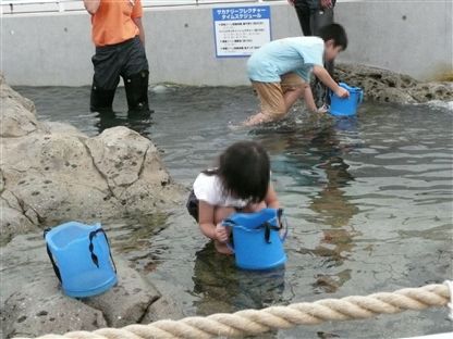 海の岩礁・砂地などが再現されています。子どもたちは、プールに直接入って遊びます。