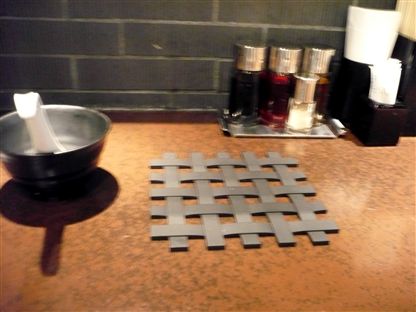 スタッフに食券を渡すと、まず鍋敷きと小鉢が提供されました。