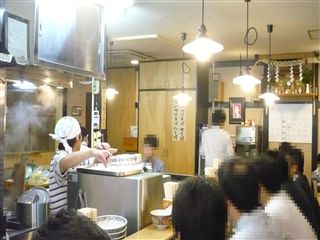 奥のカウンターからは、調理の様子が目の前で確認できます。煮干しが茶漉しに入った雪平鍋でスープを熱々に加熱していました。