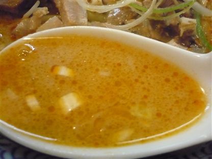 スープは、煮干、鰹、海老などから取ったダシスープに、ゴマペースト、ナッツ、豆板醤を加えて、仕上げにラー油をかけたものです。