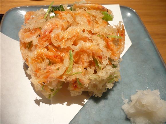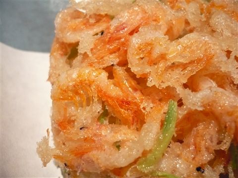 「生桜海老かき揚げ」、胡麻油で揚げられていてとっても軽く、サックサクです。