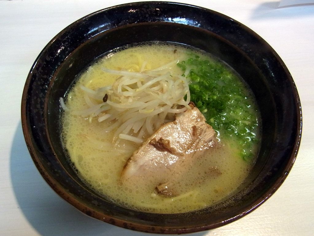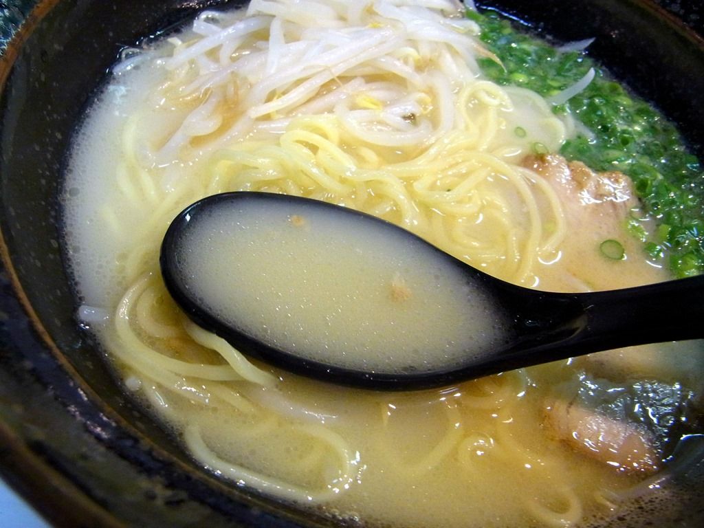 和食器といった風情で風格のある、白い鳥白湯スープが映える濃い色合いの丼で登場。 具は、ゆでもやし、チャーシュー、あさつき。