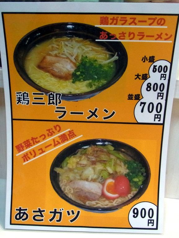 麺メニューは、鶏三郎ラーメン 小盛80g500円、並盛160g700円、大盛240g800円、あさガッツ900円。