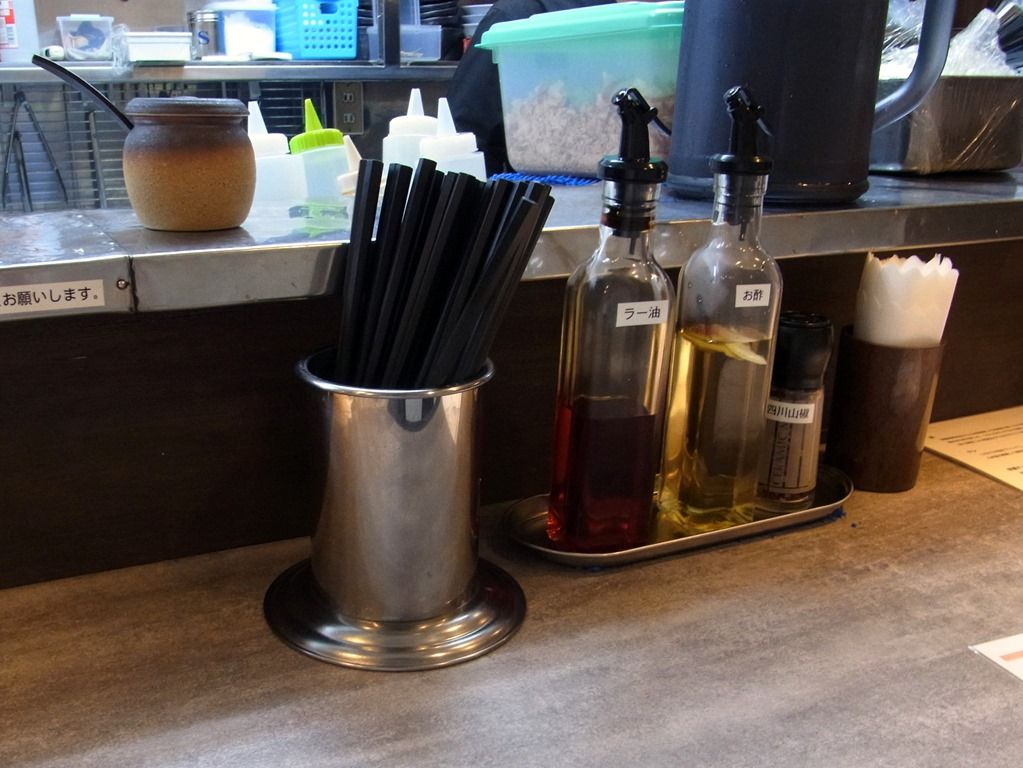 t苦情調味料は、ラー油、酢、四川山椒、高台の上の壺にはおろしニンニク。