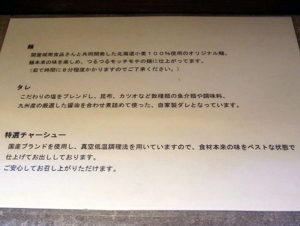 テーブル貼り付けシートには、麺・タレ・特選チャーシューの薀蓄。