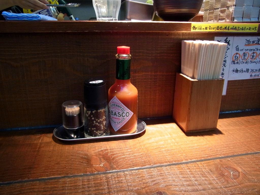 卓上調味料は、特大タバスコ、ミル入りミックスペッパー。