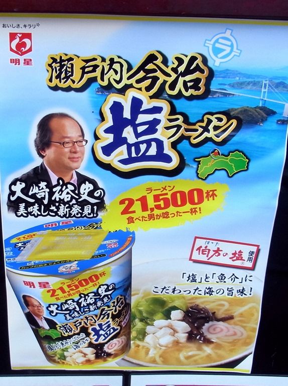 店頭看板に、『明星 大崎裕史の美味しさ新発見! 瀬戸内今治塩ラーメン』(のポスター掲示。 プレスリリースによると、