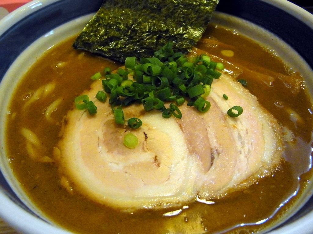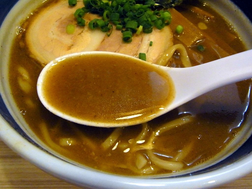 チョコレート色のスープはとろ~りとクリーミーな動物魚介の醤油味。