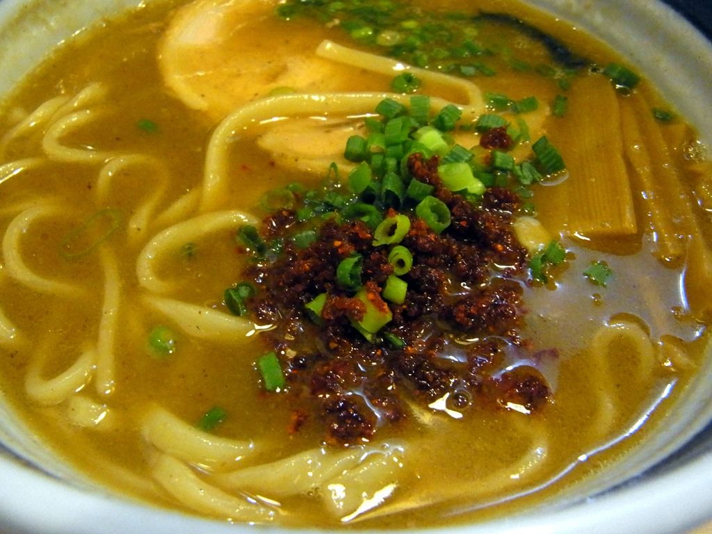 いわゆる濃厚豚骨魚介醤油味で、魚粉?魚介が強めに主張します。