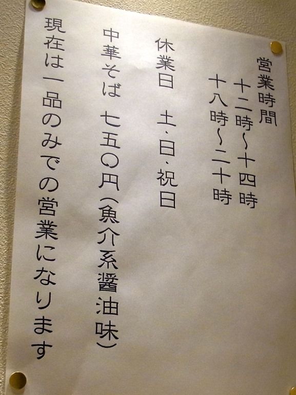 しかし、ちょっと調べたところ、オープン当初は、昼のみ2時間という営業時間、土日祝日定休というハードルの高さ。 メニューは中華そばたった1種類で、トッピングもサイドメニュー無しという潔さ。