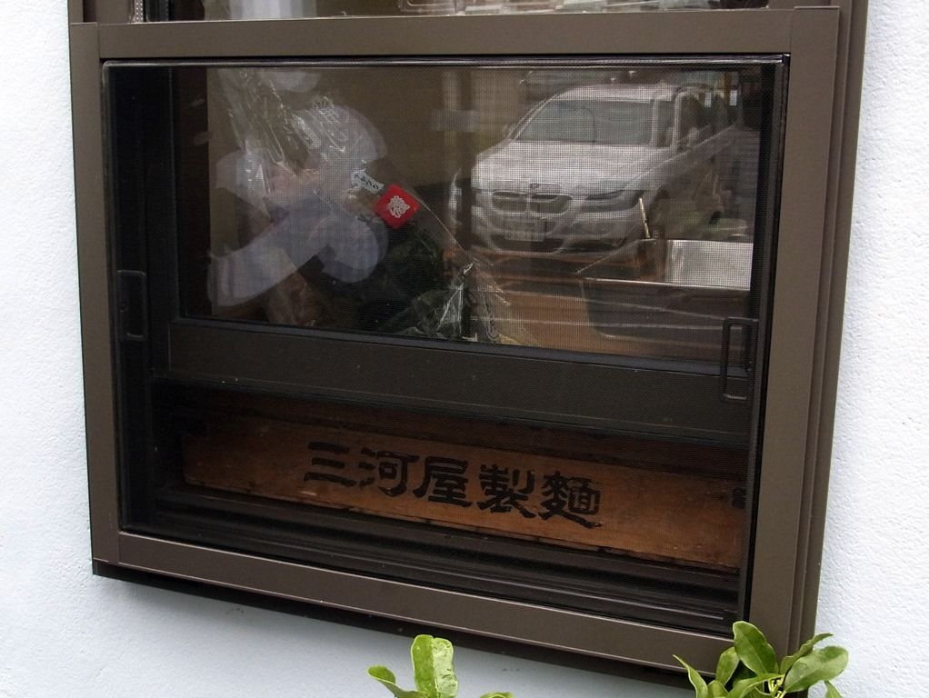 店頭から見える窓沿いに置かれた麺箱は、三河屋製麺のもの。 店内は、やけに天井が高く開放的なのが印象的。
