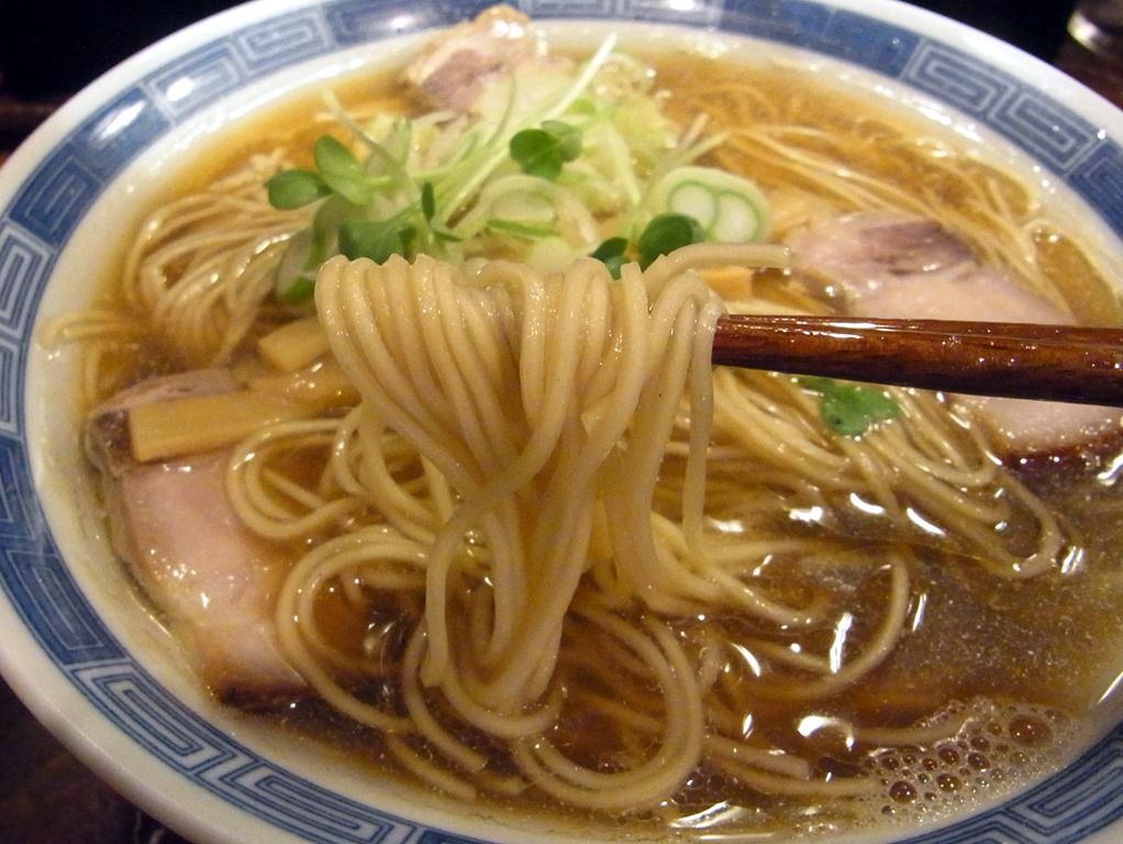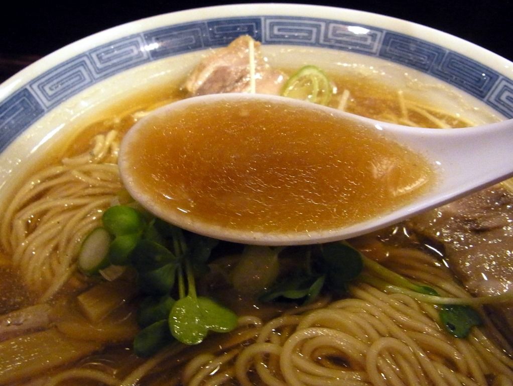 キラキラと銀鱗が浮かぶスープは、さらさらの清湯タイプ。