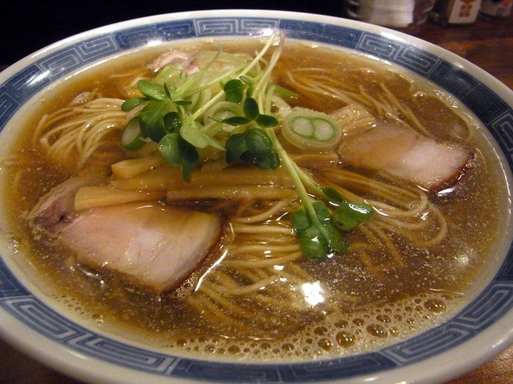 前述の薀蓄によると、「大量の煮干しを使用した淡いながらも濃厚な煮干しスープに、薄口醤油、白醤油を使用したタレを合わせました。苦味を含んだ、ビターな大人の煮干しラーメン」とか。