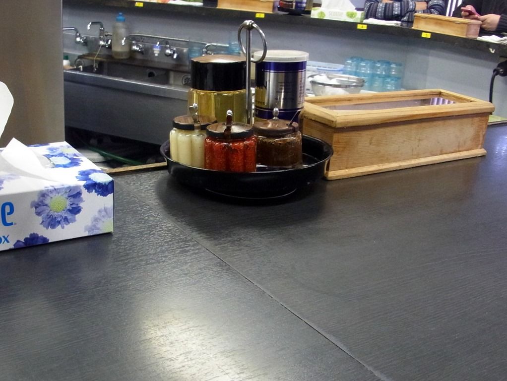 卓上調味料は、GABANのブラックペッパー、おろしニンニク、酢、豆板醤、辛子味噌?