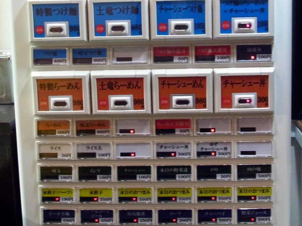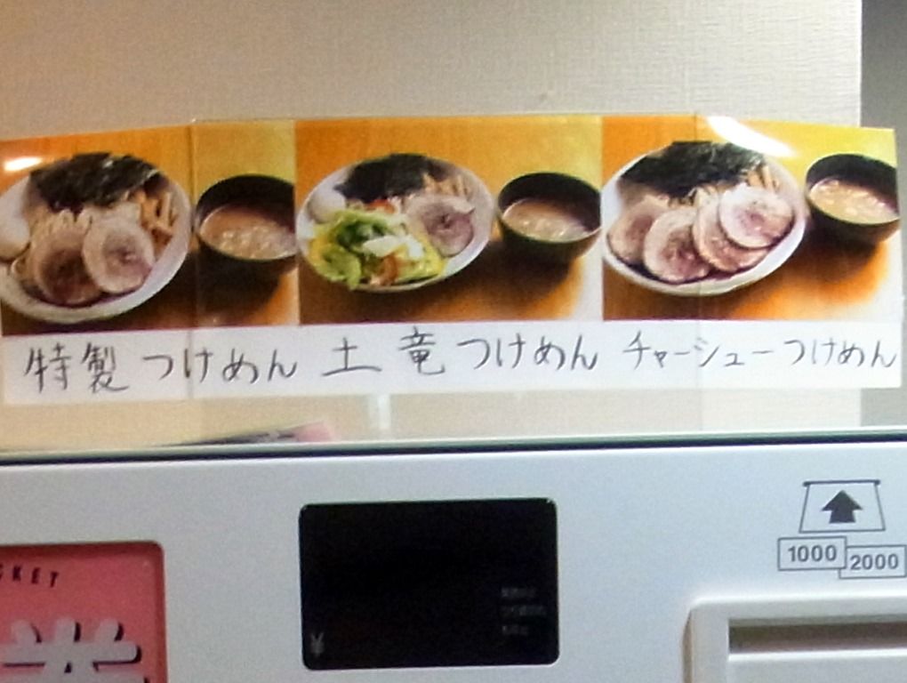入口脇にはつけ麺の提灯とカラーポスター掲示。 入店すると、まず券売機で食券購入です。