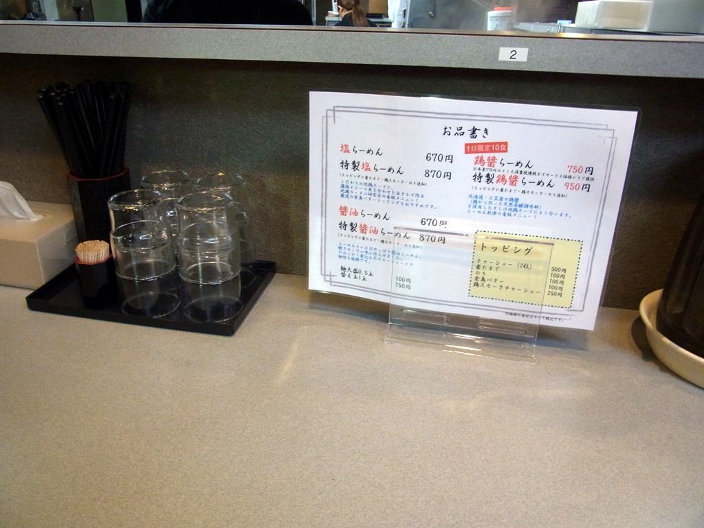 主なメニューは、塩らーめん670円、醤油らーめん670円、鶏醤らーめん750円、他。