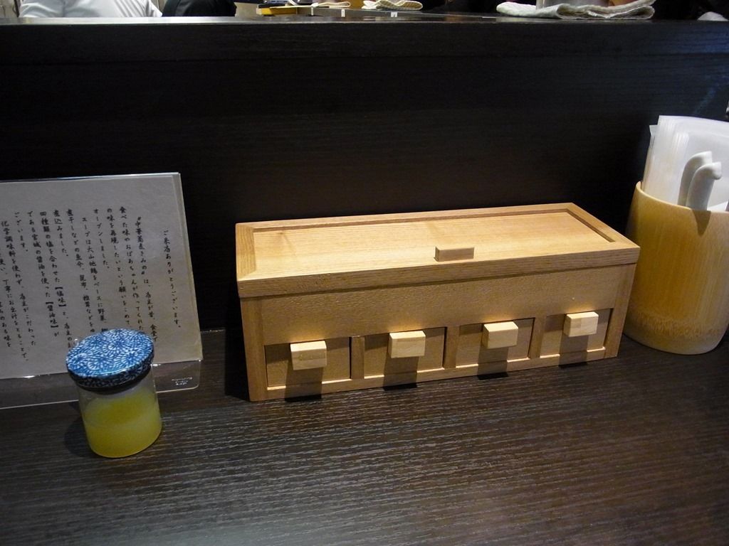 卓上の箸箱兼調味料入れが秀逸で、引出しのつまみが、そのままスプーンの柄に成増。