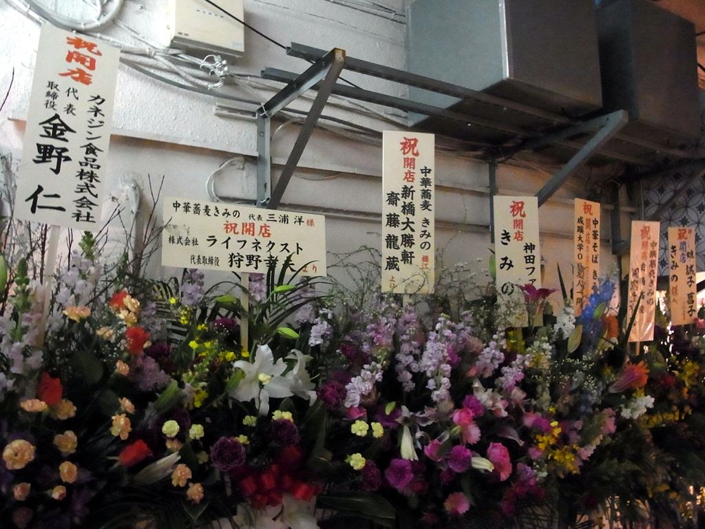店頭には開店祝花いっぱい。 ラーメン関係では、カネジン食品、新橋大勝軒から。