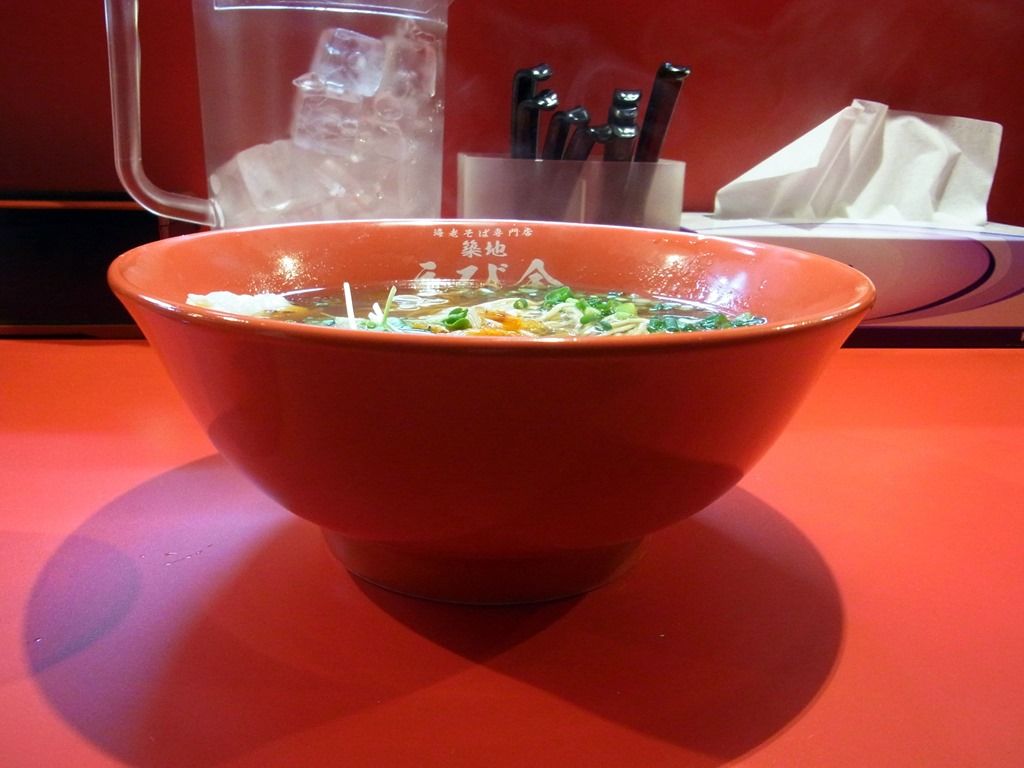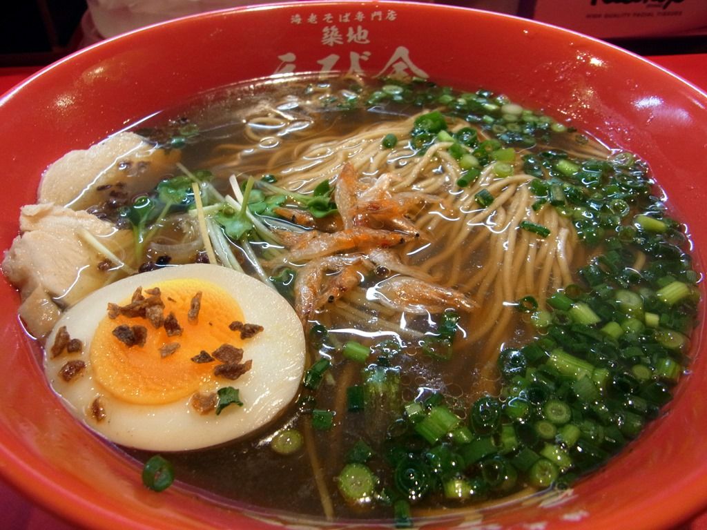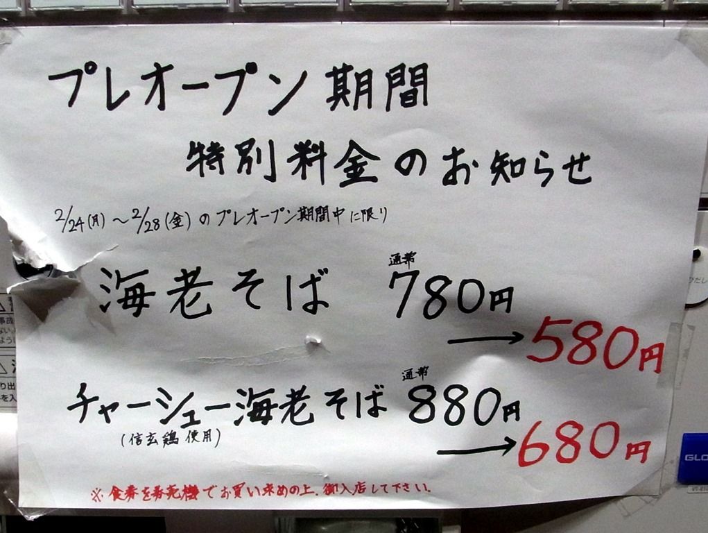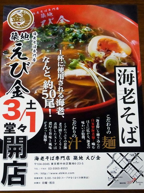 2014年3月1日オープンの海老そば専門店。正式オープン後の営業時間は5:00~14:00と築地市場タイムw ですが、2月24日~28日までのプレオープン期間、営業時間を変えて夜営業を実施。しかも、期間中200円引きという割引料金での提供。