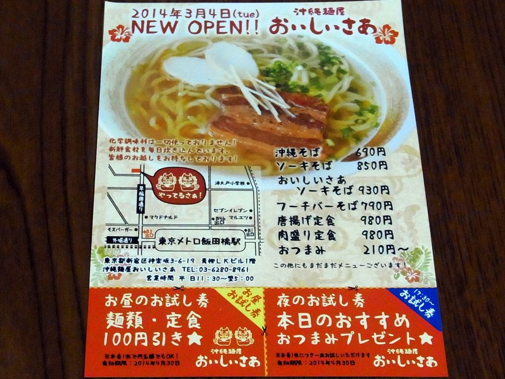 2014年3月4日、本日移転オープンの新店「沖縄麺屋 おいしいさあ」へ。