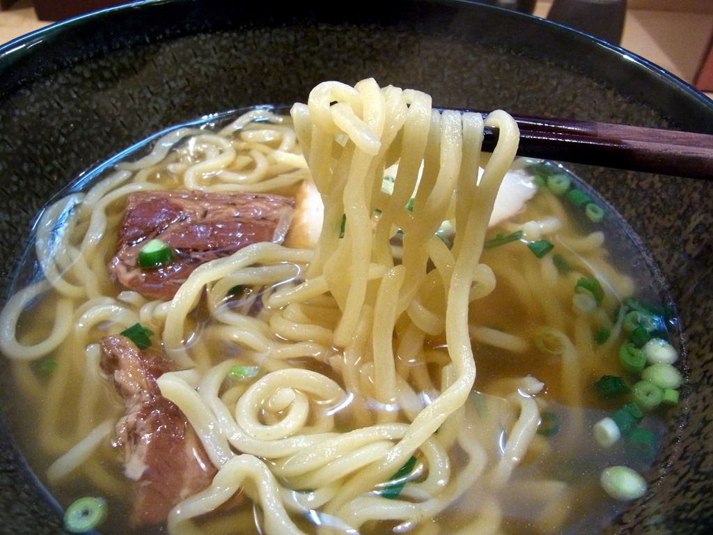 沖縄そば独特の風味とコシ、ざらつきのある食感が楽しめて、中華麺ともうどんとも一線を画す個性的な味わい。