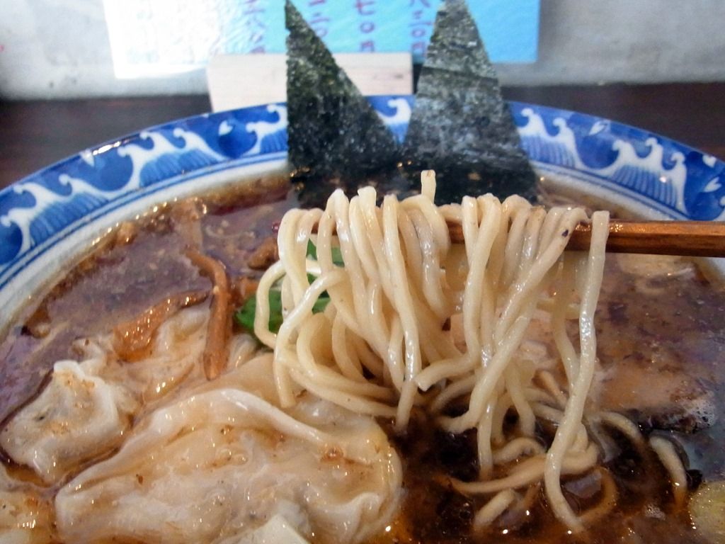 麺は中太で、わずかに縮れのあるタイプ。 厨房に大栄食品の麺箱があったので、多分そちら製。