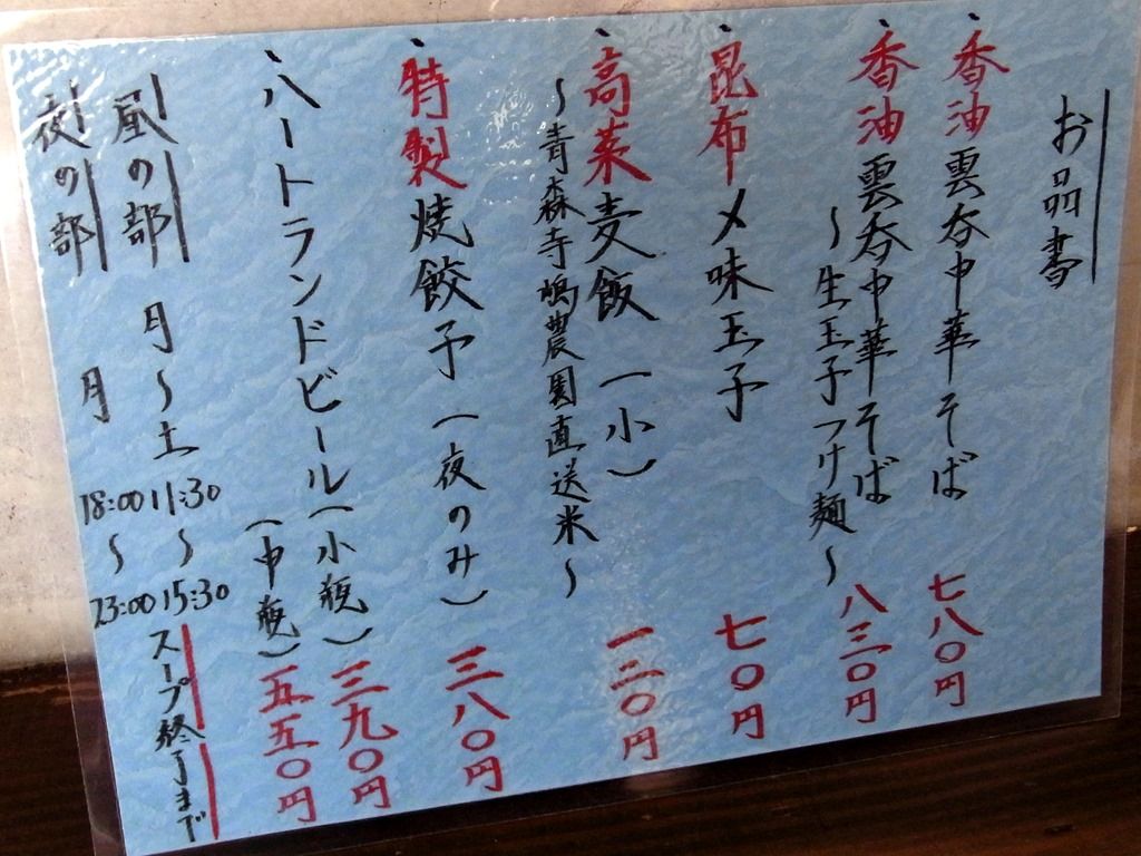 券売機は無く後会計制。主なメニューは、香油雲呑中華そば780円、香油雲呑中華そば~生玉子つけ麺~830円、昆布〆味玉子70円、他。