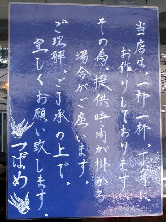 入口には、「一杯一杯丁寧に作っているため提供時間がかかる場合があります」的な内容の貼り紙。 いろいろな方のレビューで、とにかく回転が遅いとか提供までに時間がかかるとかありましたが、あらかじめ分かっていれば無問題w