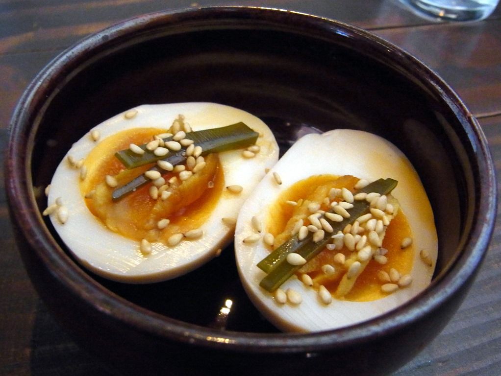 そして遅れて登場したのが「昆布〆味玉」。「少し酸っぱいのは昆布酢で〆てあるためです」とのインフォ。