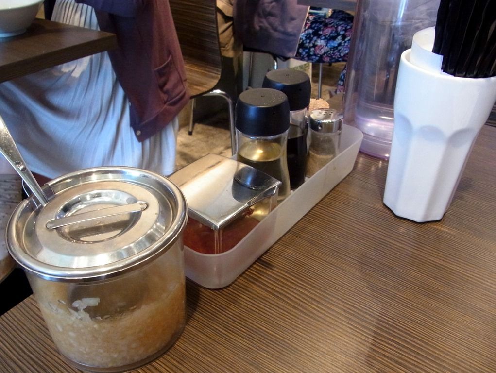 卓上調味料は、辛味噌、酢、醤油、胡椒。