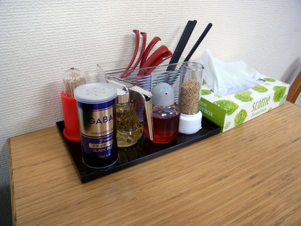 卓上調味料は、GABANブラックペッパー、酢、ラー油、ゴマ。