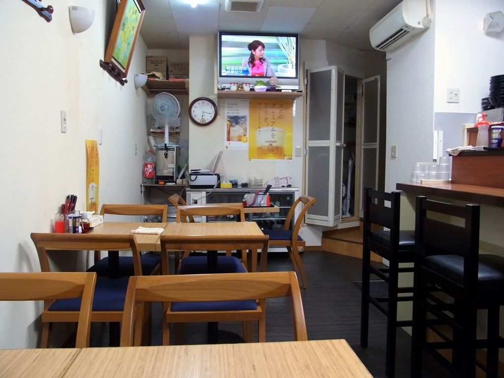 店内は、厨房前に真直ぐなカウンター6席、4人卓x2、2人卓x1。