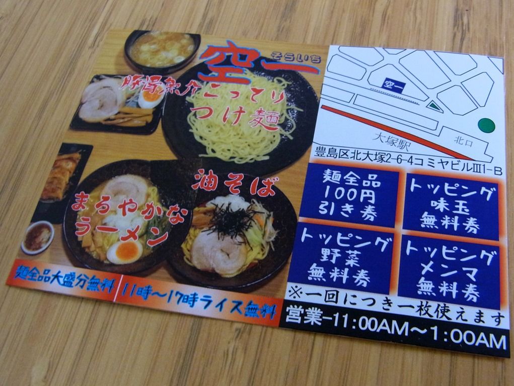 2014年7月25日、大塚の新店「つけ麺 油麺 ラーメン 空一(そらいち)」へ。