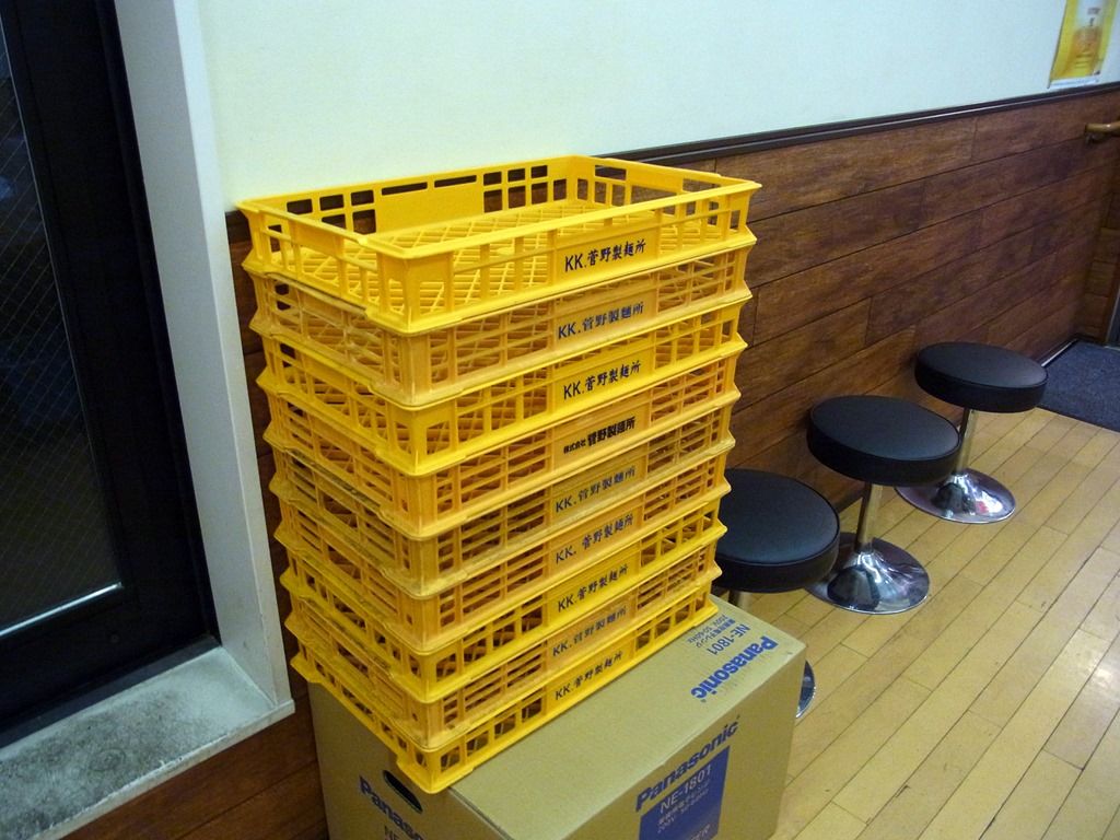店内隅っこに、菅野製麺所の麺ケースが山積み。