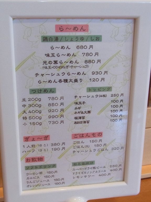 主なメニューは、鶏白湯ら~めん680円、しょうゆら~めん680円、しおら~めん680円、つけめん 並780円、他