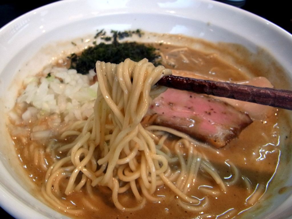 麺は、カネジン食品製の中太ほぼストレートタイプ。 エッジの効いた硬質な麺が、ドロっとした煮干しスープを纏ってすこぶる美味!