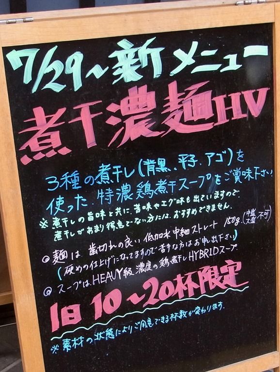 店頭A型立て看板には、7月29日からの新メニュー「煮干濃麺HV」のインフォ。