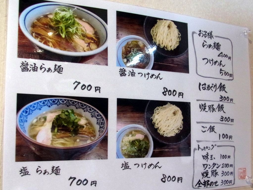 主なメニューは、醤油らぁ麺700円、醤油つけめん800円、塩らぁ麺700円、塩つけ麺800円、半らぁ麺400円、半つけ麺500円、はまぐり飯300円、焼豚飯300円、他。