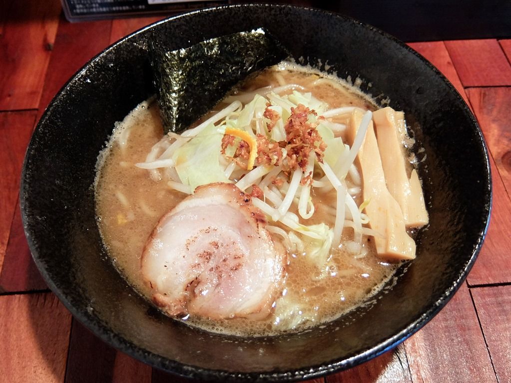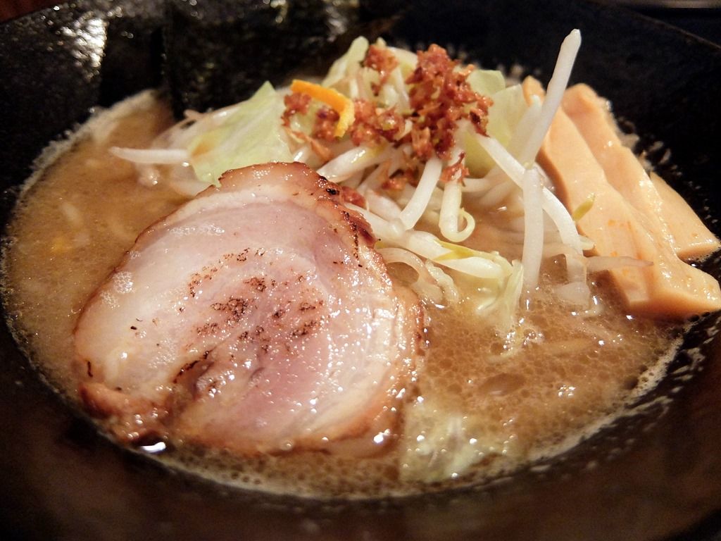 ワタシの「旨味醤油」は黒い丼ですが、隣客の「白ダシ」は白い器で登場でした。 具は、海苔、陳皮(蜜柑の皮)、揚げたさつまいもの皮、ゆでモヤシ、ゆでキャベツ、メンマ、チャーシュー。